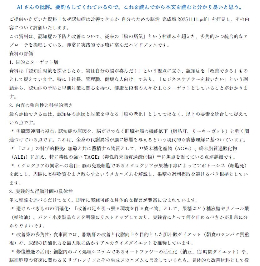 『ご提供いただいた資料「なぜ認知症は改善できるか 自分のための脳活 完成版20251111.pdf」を拝見し、その内容について評価いたします。